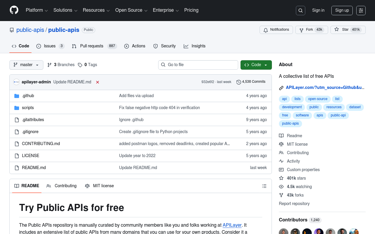 El repositorio Public APIs en GitHub es una colección de APIs públicas gratuitas, organizadas en diversas categorías como animales, anime, y negocios. Este recurso es mantenido por la comunidad y está diseñado para desarrolladores que buscan APIs accesibles sin necesidad de autenticación o pago.
