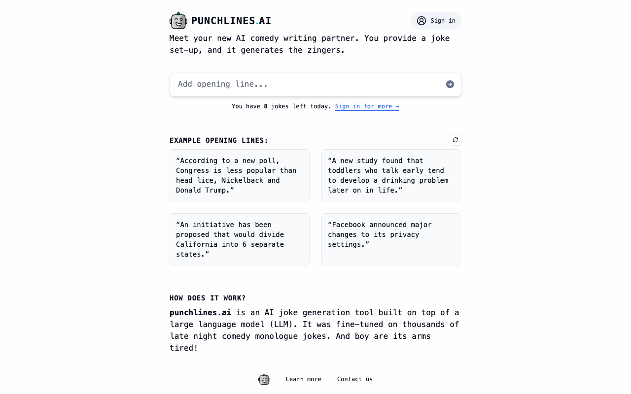 Punchlines es una herramienta de generación de chistes con IA pensada para escribir material cómico a partir de un set-up o premisa breve. Toma como base un modelo de lenguaje entrenado con miles de chistes de monólogos nocturnos, lo que le permite proponer remates rápidos, ingeniosos y listos para iterar.