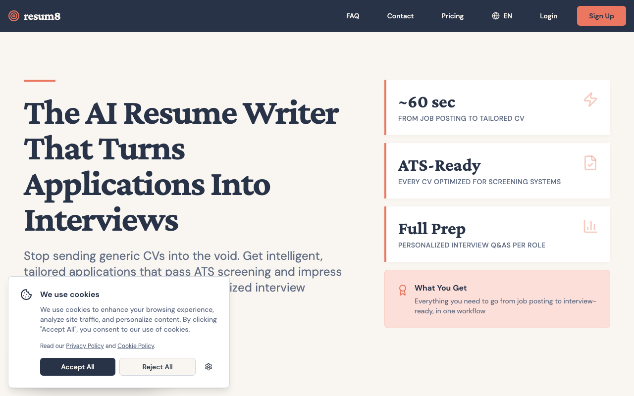 resum8 es una herramienta de IA que ayuda a crear y ajustar currículos y cartas de presentación para cada descripción de trabajo.