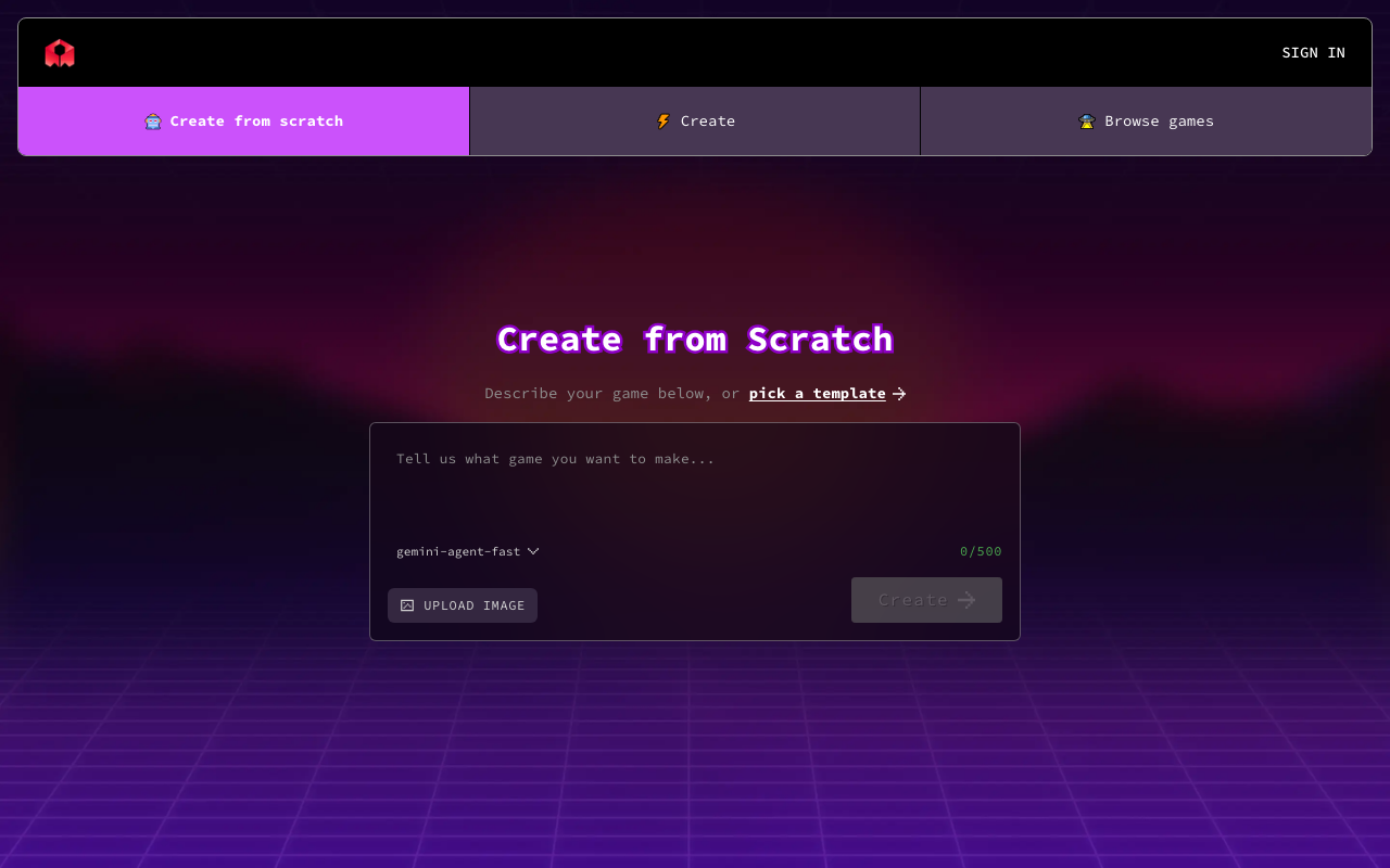 Crea juegos 2D y 3D desde una descripción, genera el código automáticamente y despliega en el navegador para compartir al instante.