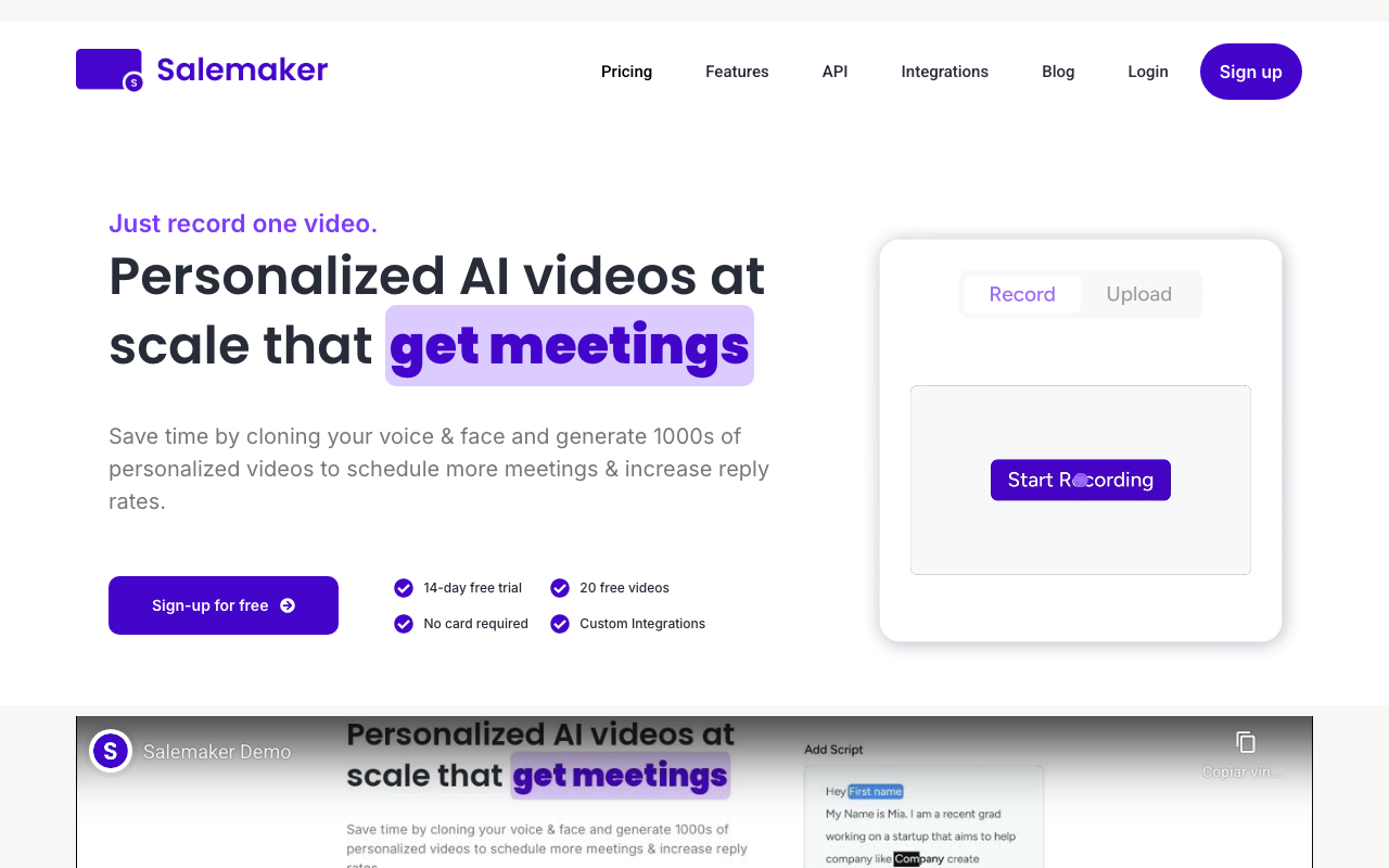 Salemaker te ayuda a automatizar el envío de videos tipo Loom, pero con personalización real para cada lead. La idea es simple: grabas un solo video de presentación, y luego el sistema genera miles de variaciones usando tu voz y sincronizando tu cara, para que cada destinatario reciba un mensaje que se siente hecho a mano.