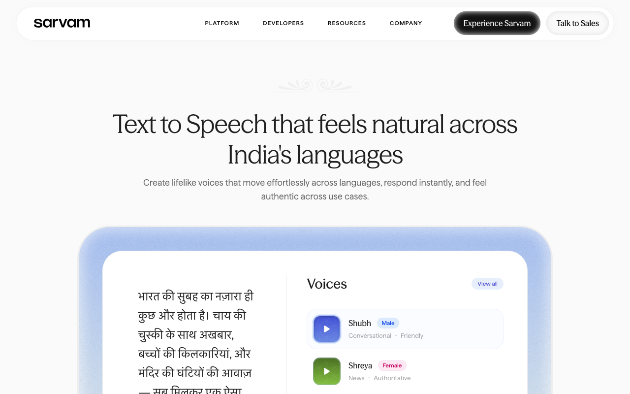 Convierte texto en voz natural para equipos y desarrolladores que necesitan locuciones auténticas en 11 idiomas de India, con control de emoción y baja latencia.
