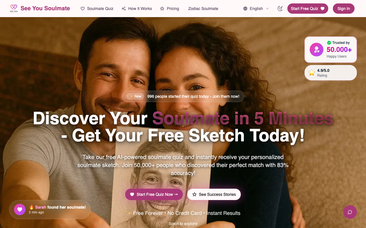 See You Soulmate propone una experiencia de entretenimiento basada en IA para crear un boceto personalizado de tu alma gemela. Combina un cuestionario de personalidad con elementos de astrología y psicología para entregar un resultado visual y una lectura amorosa en pocos minutos.
