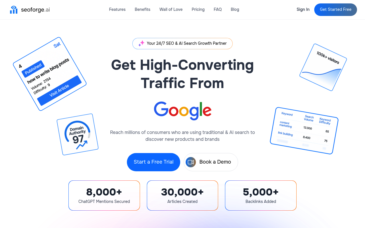 SEOForge.ai es una plataforma de contenido SEO impulsada por IA que optimiza el posicionamiento en buscadores y mejora la visibilidad de las marcas.