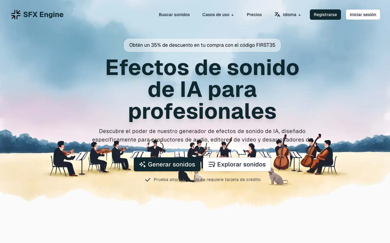 SFX Engine es un generador de efectos de sonido con IA pensado para crear audio original a partir de descripciones. Permite producir desde ambientes naturales hasta sonidos artificiales, con opciones de uso comercial incluidas por defecto.