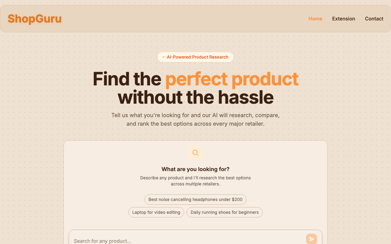 ShopGuru ayuda a ahorrar tiempo y esfuerzo en la investigación de productos. Con su análisis impulsado por IA, ShopGuru compara y clasifica las mejores opciones entre los principales minoristas, analizando reseñas, especificaciones y precios para clasificar los productos por relevancia, valor y calidad general.