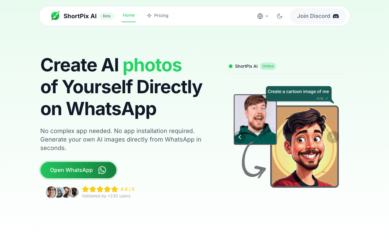 ShortPix AI lleva la creación de retratos con IA a un canal que casi todos ya usan: WhatsApp. En lugar de aprender software complejo o instalar una app pesada, solo envías un mensaje, subes tus fotos y dejas que el bot haga el trabajo.