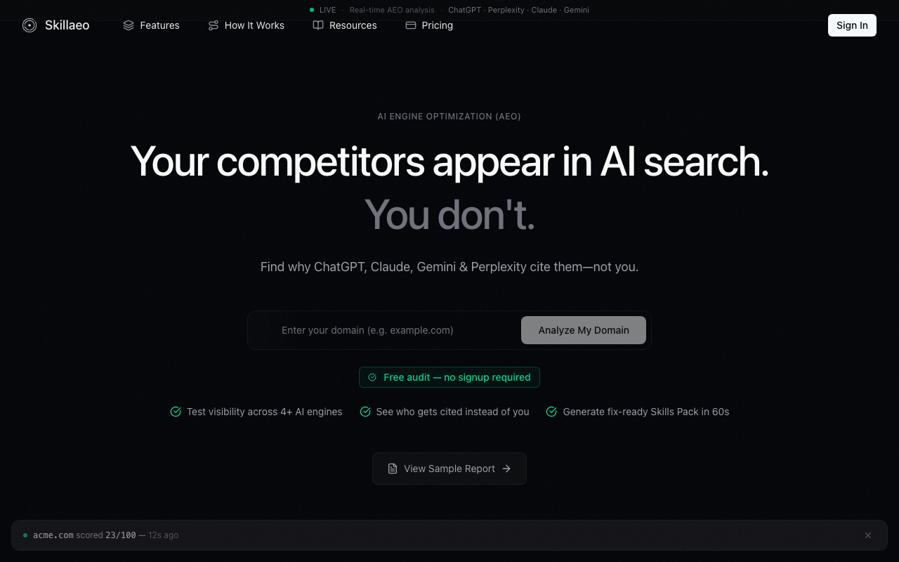 Skillaeo ayuda a resolver problemas relacionados con la visibilidad de la marca en motores de búsqueda AI. Proporciona análisis en tiempo real, insights sobre la competencia, sugerencias de correcciones prioritarias y un generador de paquetes de habilidades que automatiza la creación de archivos legibles por máquinas como llms.txt y agent.json.