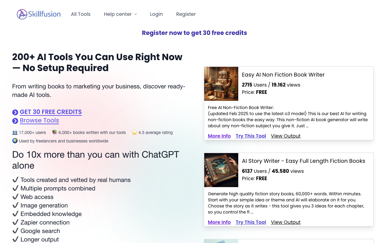 Skillfusion es un marketplace de herramientas de IA orientado a productividad y creatividad. Reúne utilidades listas para usar y también permite crear herramientas propias con un constructor gratuito, lo que lo vuelve útil tanto para explorar como para experimentar.