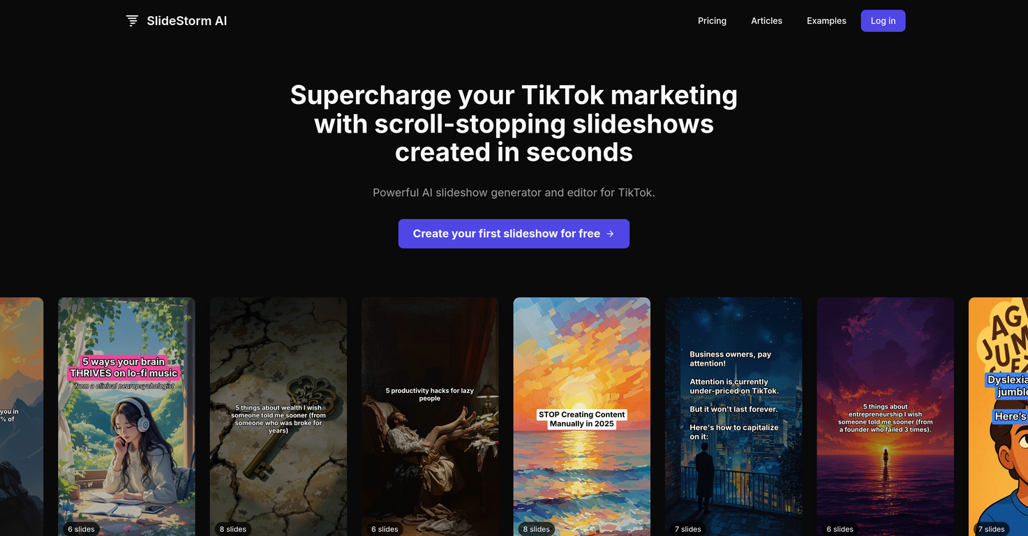 SlideStorm simplifica y acelera la creación de contenido atractivo para TikTok, permitiendo a los usuarios generar presentaciones de calidad profesional en solo tres pasos. Esto ahorra tiempo y esfuerzo, facilitando la gestión de múltiples cuentas de TikTok.