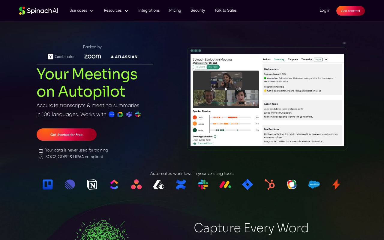 Spinach.ai pone las reuniones en "piloto automático", asegurando que ningún detalle importante se pierda y que las tareas se gestionen de manera eficiente. Su capacidad para integrarse con múltiples plataformas y su soporte multilingüe lo hacen una herramienta versátil y poderosa para cualquier equipo.