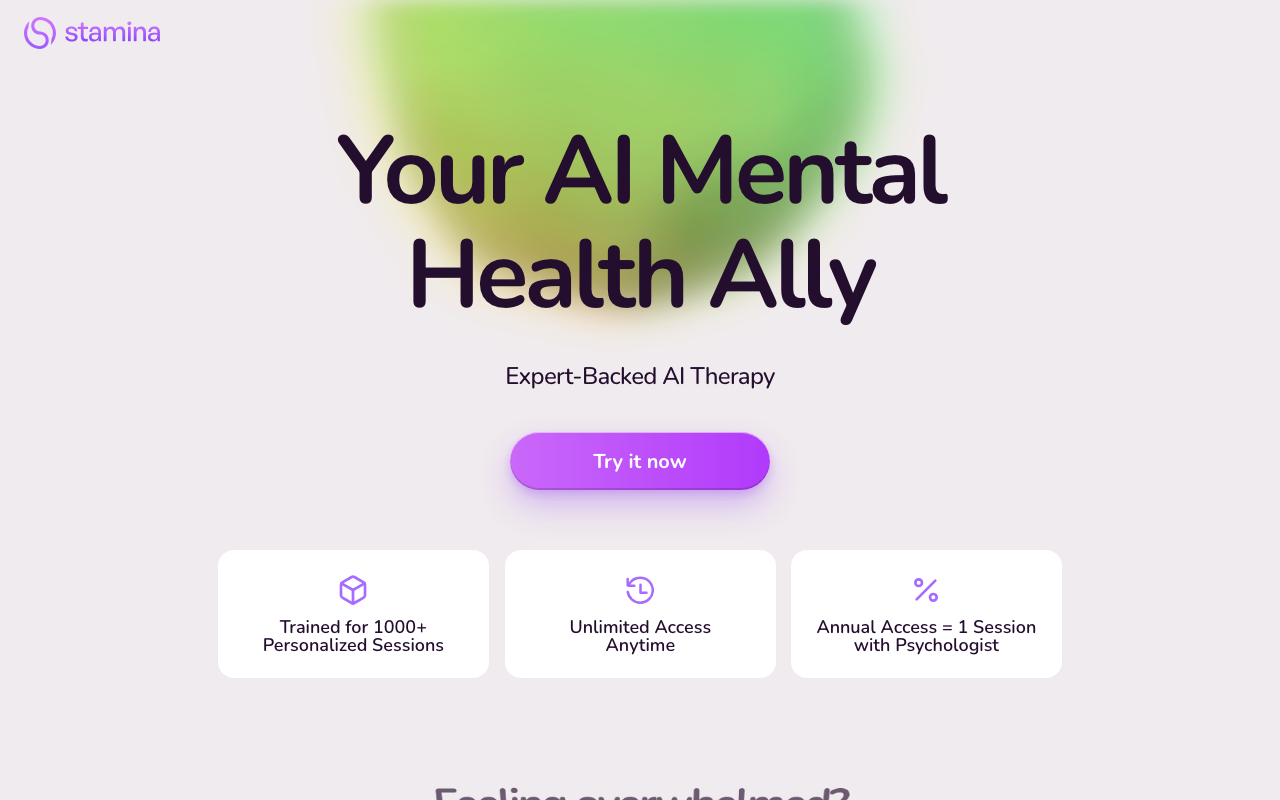Stamina AI es una plataforma de terapia asistida por inteligencia artificial pensada como un aliado de salud mental disponible en cualquier momento. Su propuesta combina acompañamiento conversacional, orientación personalizada y un enfoque basado en evidencia, con respaldo de profesionales del área.