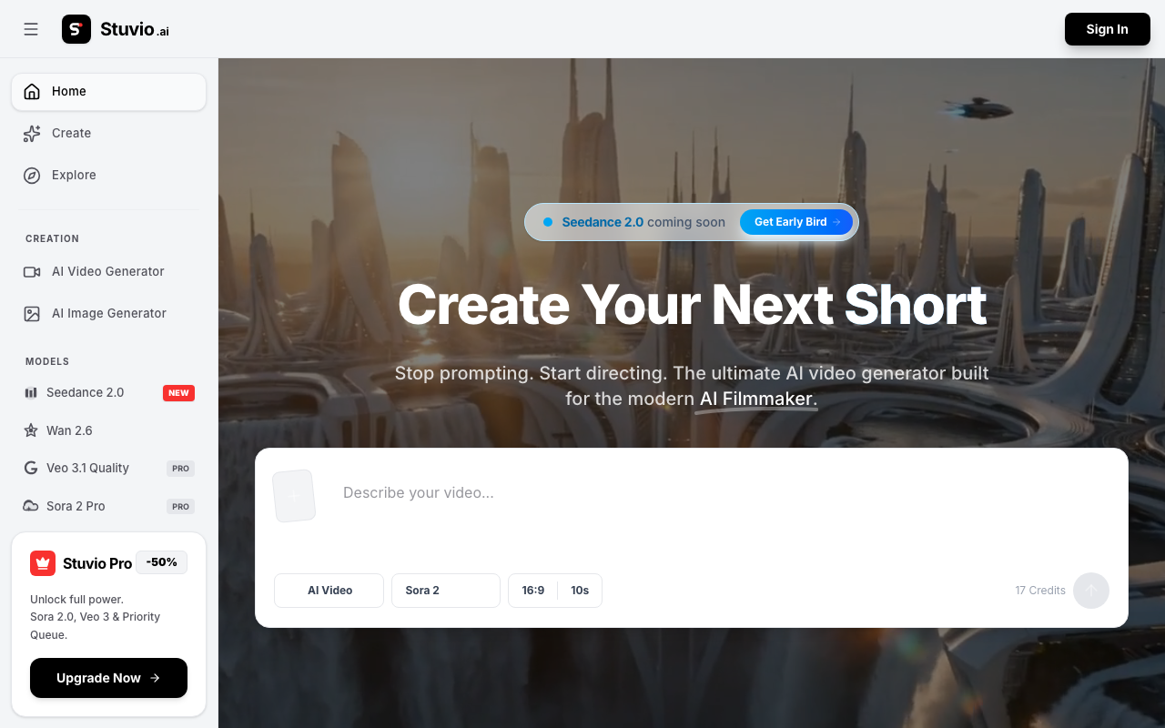En Stuvio creas videos a partir de indicaciones y controles creativos, apoyándote en modelos como Seedance 2.0, Veo 3.1 y Wan 2.6. La idea es que no dependas de un solo motor, sino que puedas alternar capacidades según lo que estés buscando en cada proyecto.