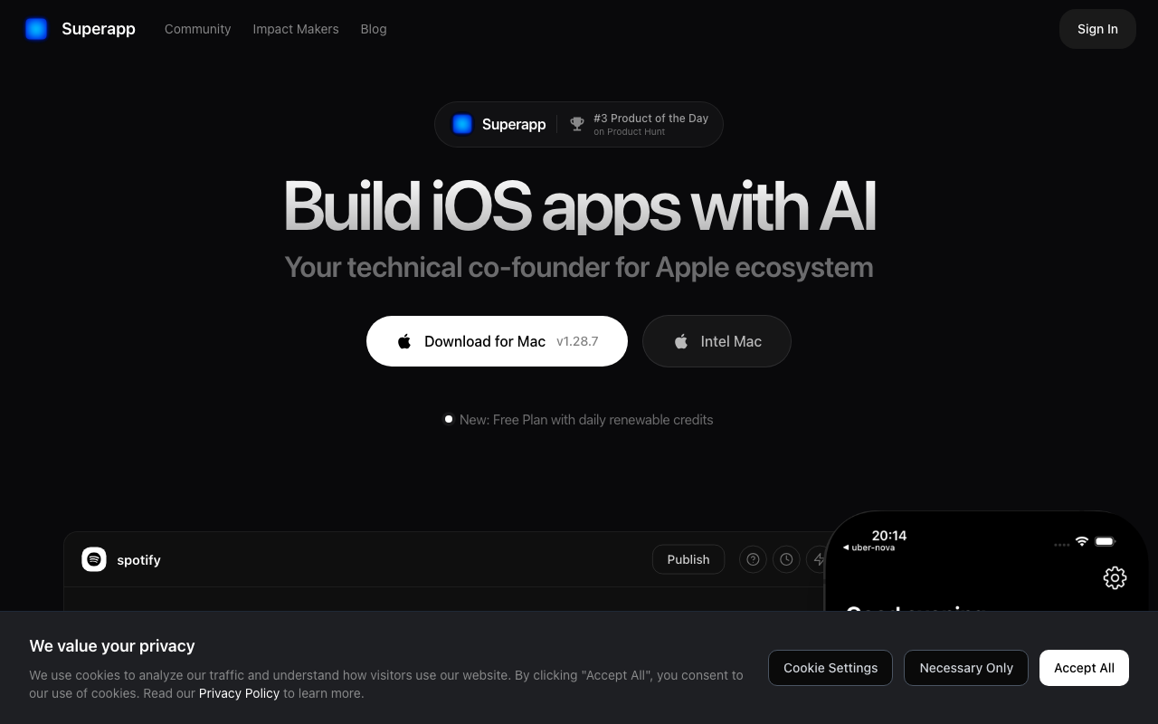 Superapp es una plataforma con IA pensada para convertir ideas en aplicaciones nativas para iPhone y iOS de forma rápida. Su propuesta se centra en simplificar el desarrollo móvil para personas y equipos que no quieren escribir código ni coordinar con un desarrollador desde el inicio.