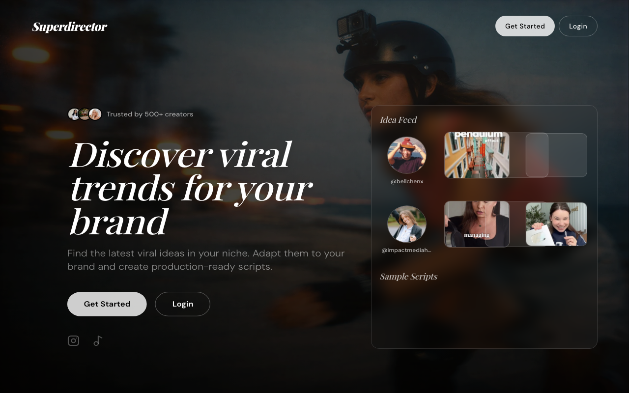 Superdirector ayuda a equipos de social media a transformar una URL de marca, creador o contenido en un flujo de trabajo listo para producir. Detecta tendencias del nicho, propone ideas de guion y, a partir de una selección, genera el guion completo, storyboard y plan de producción.
