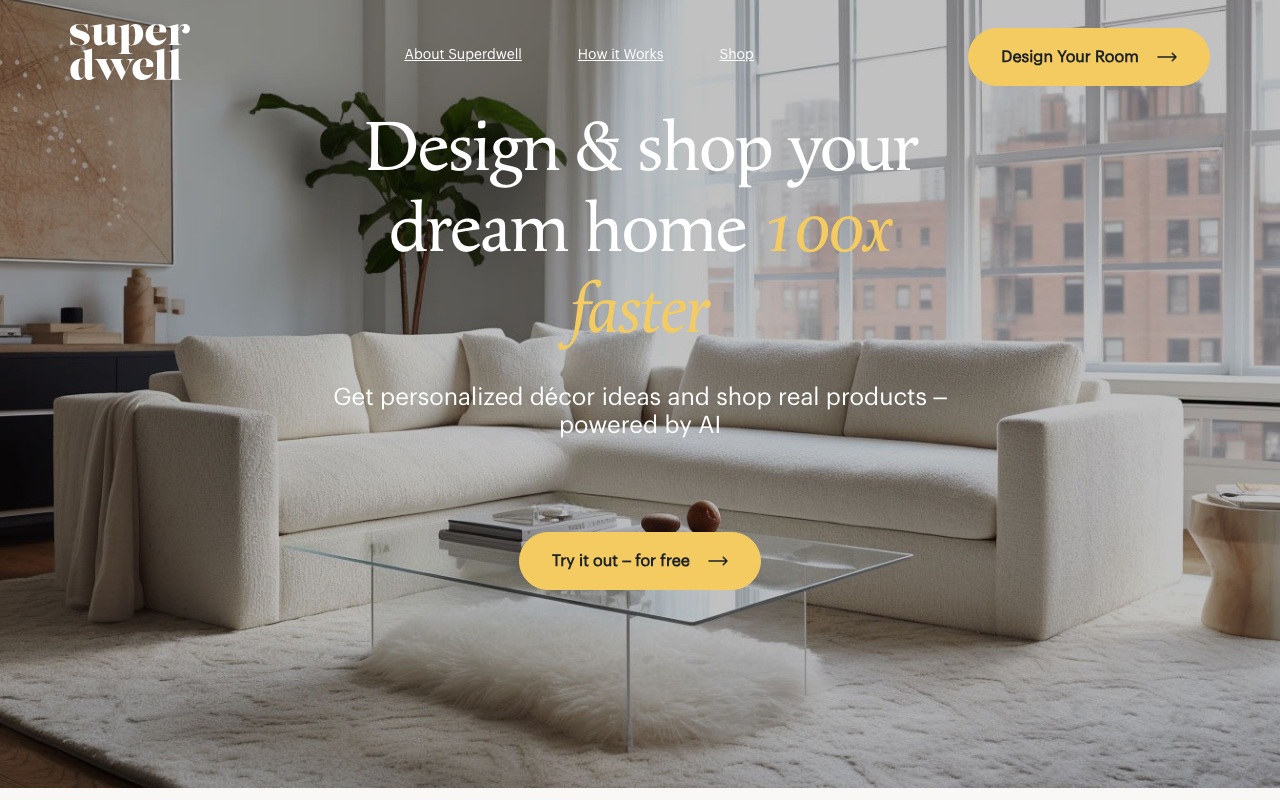 Superdwell es un diseñador de habitaciones online con IA pensado para crear y visualizar ideas de interiorismo de forma rápida. Permite subir una foto del espacio o empezar desde cero, definir un estilo y obtener propuestas visuales con productos reales para comprar.