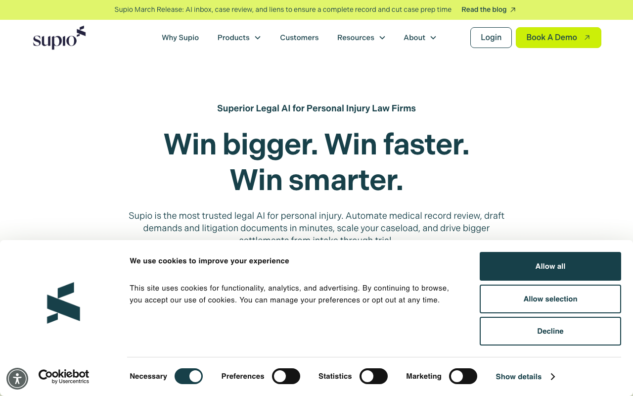 Supio es una plataforma de IA legal diseñada para apoyar a las firmas de lesiones personales en todo el proceso de casos, desde la toma de casos hasta el veredicto.