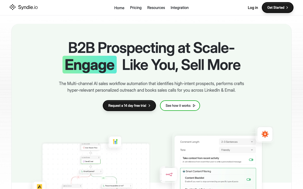 Syndie.io es una plataforma de automatización de ventas impulsada por IA que ayuda a empresas y profesionales a automatizar acciones en LinkedIn, como me gusta, comentarios y mensajes, para mejorar la eficacia en ventas y networking.