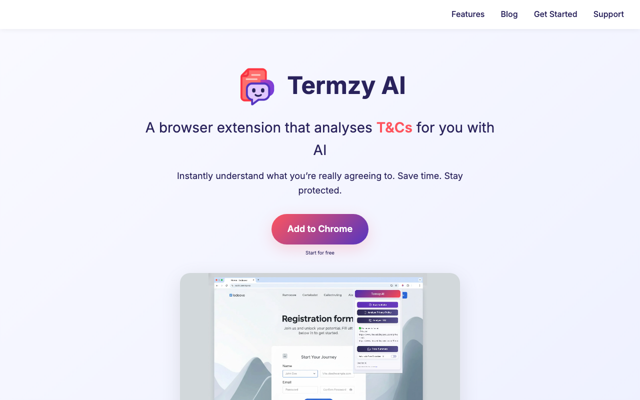 Termzy AI es una extensión de Chrome que analiza políticas de privacidad y términos y condiciones con inteligencia artificial, proporcionando una comprensión clara y rápida de los documentos legales.