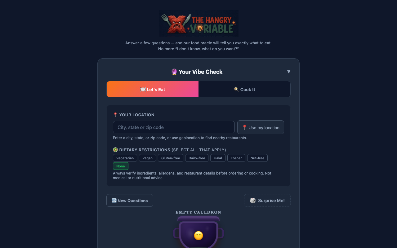 The Hangry Variable es una herramienta de IA que proporciona recomendaciones personalizadas de alimentos basadas en el estado de ánimo, ubicación y restricciones dietéticas del usuario.