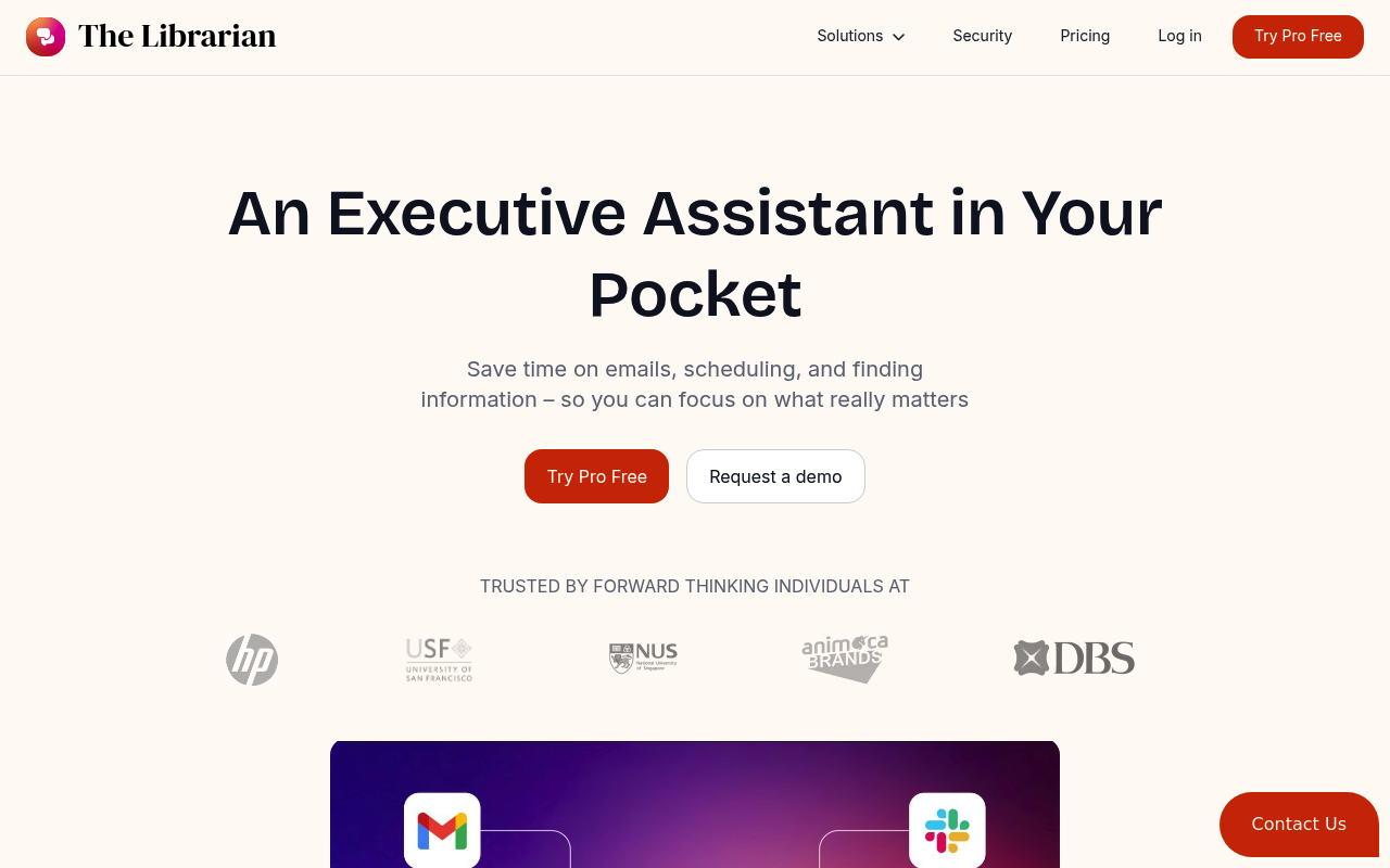 TheLibrarian.io aborda los cuellos de botella de productividad al permitir la gestión eficiente del correo electrónico, la programación de reuniones sin conflictos, la búsqueda rápida de documentos y la creación de recordatorios. Todo esto se realiza mediante comandos de voz o texto a través de aplicaciones de mensajería, lo que minimiza la necesidad de organización manual.