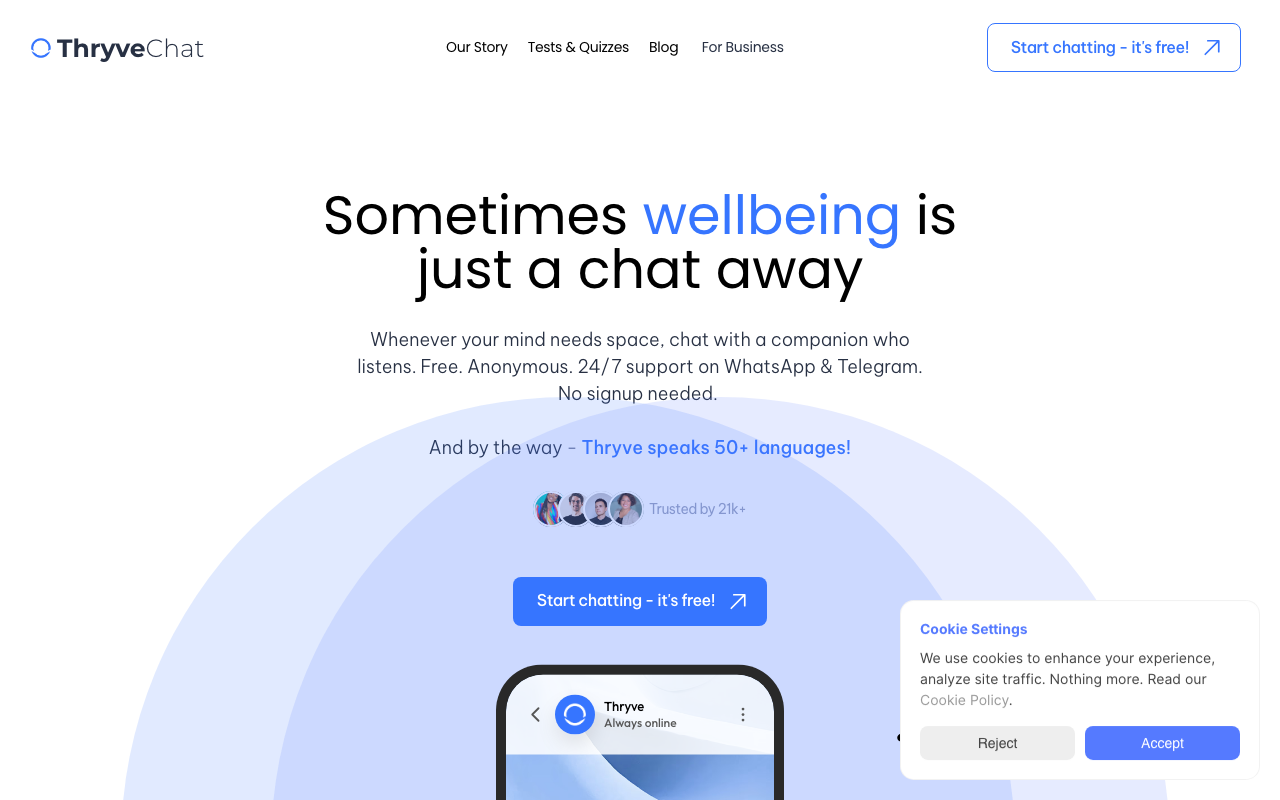 Thryve es un coach de bienestar impulsado por IA con el que puedes hablar cuando lo necesitas. Funciona como un acompañante digital, con enfoque en mejorar tu día a día a través de recomendaciones personalizadas en áreas como nutrición, actividad física y mindfulness.