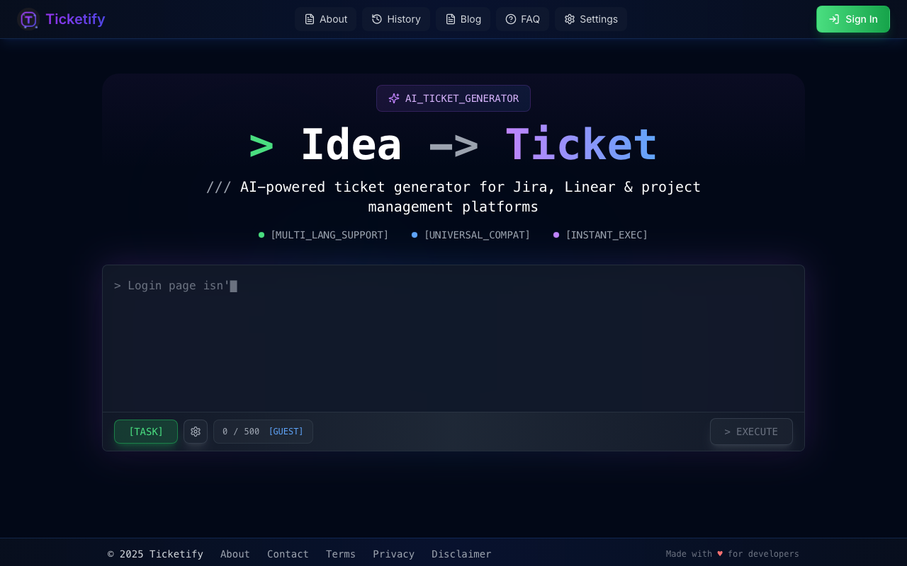 Ticketify es una herramienta de inteligencia artificial especializada en la generación automática de tickets a partir de informes de errores. Esta herramienta está diseñada para ayudar a los desarrolladores a mejorar su flujo de trabajo al automatizar la transformación de los informes de errores en tickets profesionales para plataformas de gestión de proyectos como Jira, Linear y Trello.