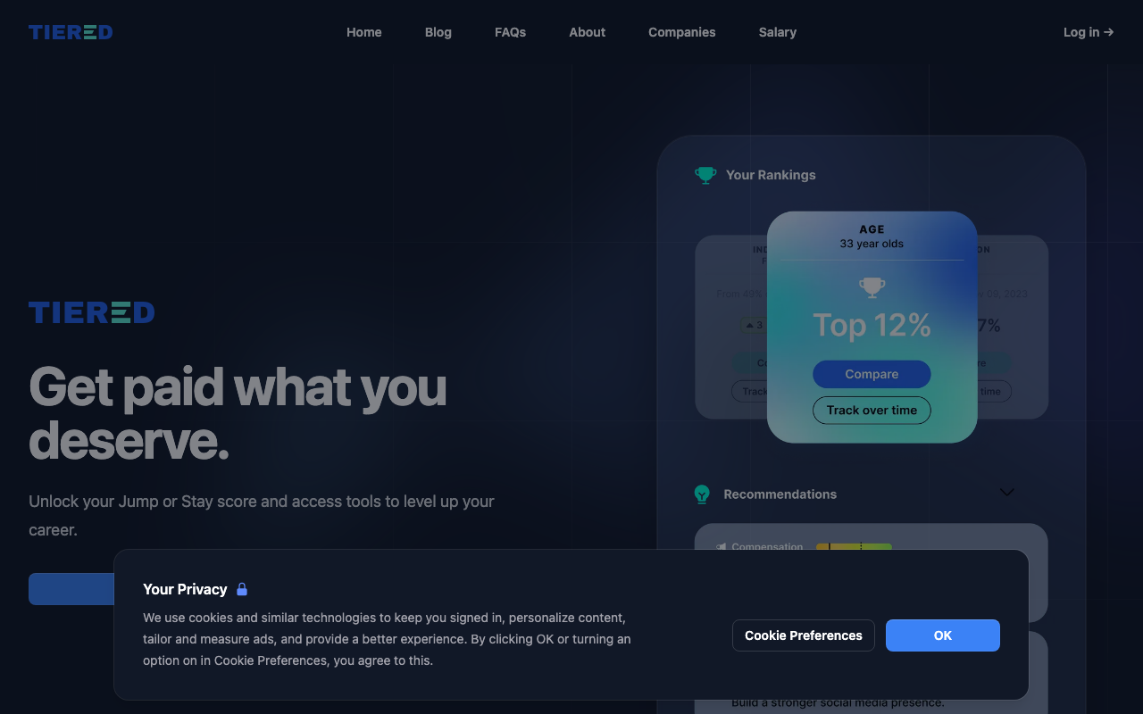 Tiered es una plataforma de coaching de carrera impulsada por IA que analiza factores como experiencia, educación, compensación y empleabilidad para ofrecer recomendaciones concretas sobre tu siguiente paso profesional.