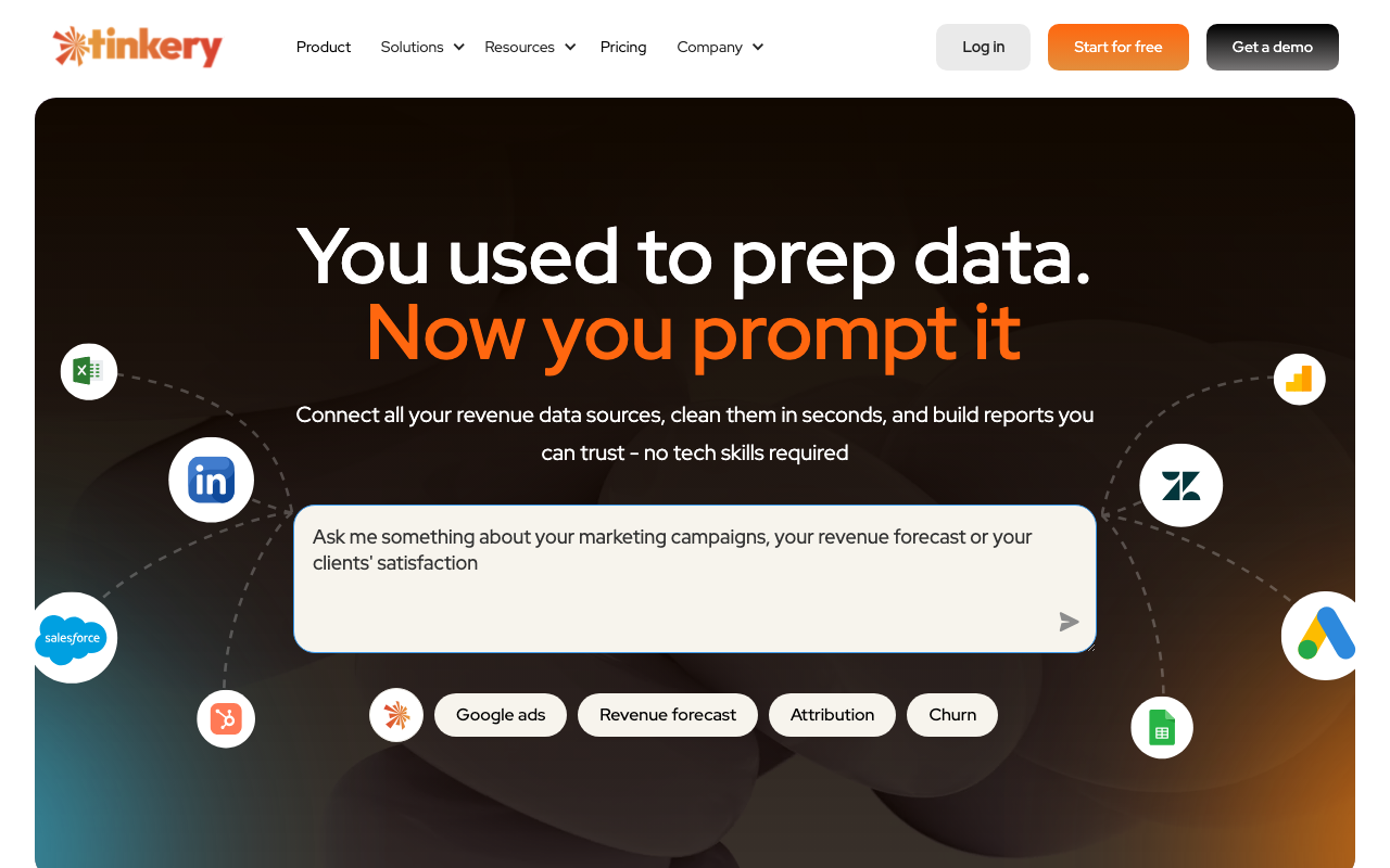 Tinkery es una plataforma de inteligencia comercial pensada para pequeñas y medianas empresas que necesitan ordenar sus datos y convertirlos en decisiones accionables. Centraliza fuentes de marketing, ventas y customer experience en un solo entorno, con limpieza automática de datos, consultas en lenguaje natural y tableros personalizables.