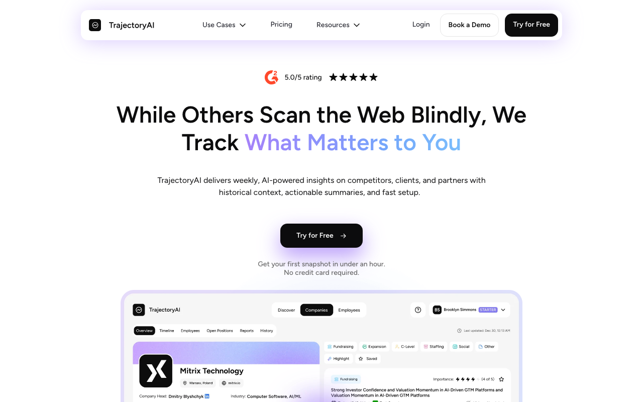 Trajectory AI centraliza información pública de competidores, clientes y socios y la transforma en resúmenes claros con contexto histórico. Su enfoque está pensado para equipos que necesitan entender movimientos del mercado sin perder horas revisando fuentes dispersas.