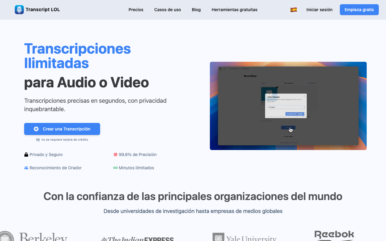 Transcript LOL transcribe audio y video con IA, genera resúmenes automáticos y permite chatear con tu contenido de forma personalizada.