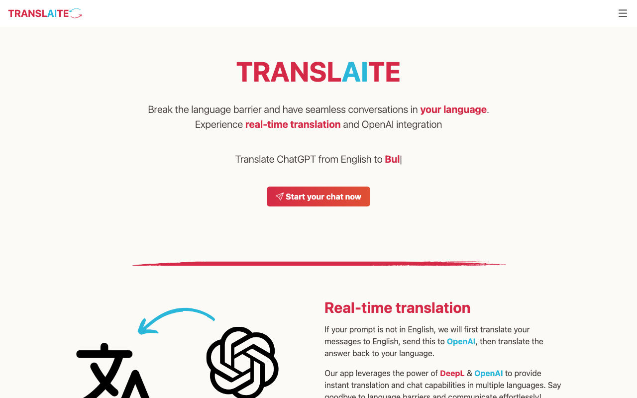 Translaite es una herramienta de inteligencia artificial que facilita la comunicación entre diferentes idiomas mediante traducciones en tiempo real. Utiliza la potencia de DeepL y OpenAI para traducir y generar respuestas inteligentes y contextualizadas.