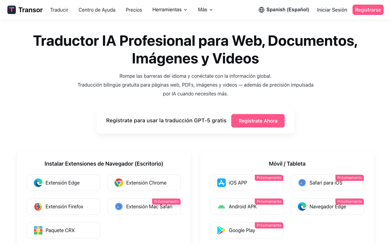 Transor es una herramienta de traducción AI que facilita la traducción de sitios web, subtítulos de videos, documentos PDF e imágenes en tiempo real.