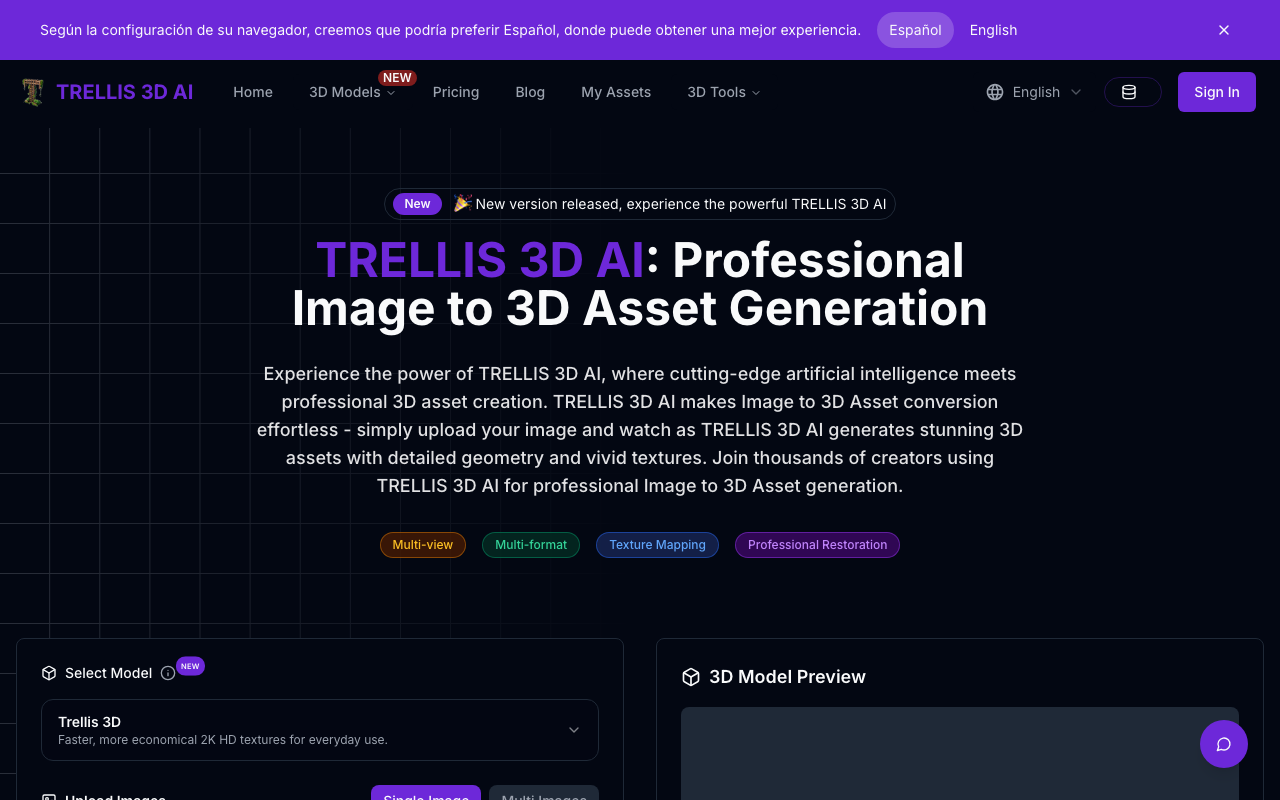 TRELLIS 3D AI es una herramienta web que convierte imágenes 2D en activos 3D profesionales. Utiliza tecnología de IA avanzada para generar modelos 3D detallados y con texturas vívidas a partir de imágenes subidas por los usuarios. Los usuarios pueden previsualizar los modelos 3D generados en el navegador antes de descargarlos.
