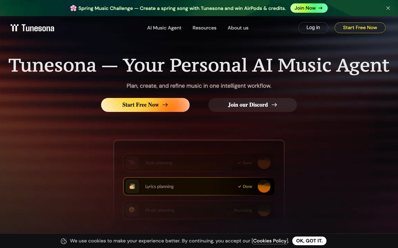 Tunesona es un agente de música con IA que convierte ideas en canciones y permite editarlas mediante conversación natural. En lugar de trabajar con una interfaz técnica, puedes describir lo que buscas y refinar el resultado paso a paso con instrucciones simples.