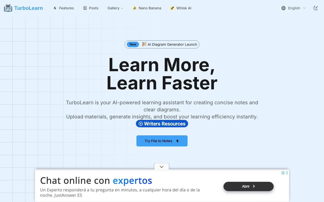TurboLearn es un asistente de estudio con IA pensado para transformar materiales largos o desordenados en resúmenes claros, notas concisas y diagramas fáciles de entender. La idea es simple: subes tu contenido y la plataforma te devuelve una versión mucho más digerible para repasar sin perder tiempo.
