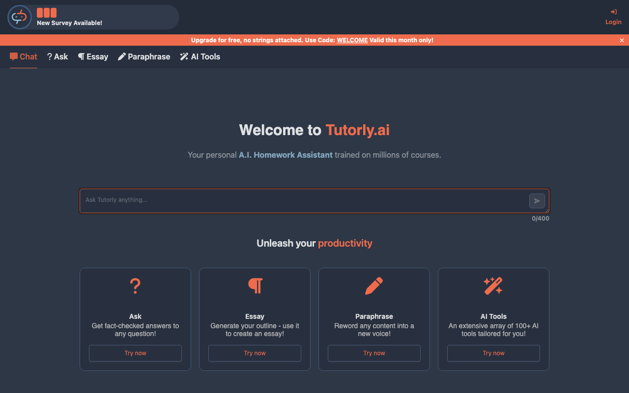 Tutorly es un asistente de estudio con IA pensado para resolver dudas escolares de forma rápida. Permite pegar una pregunta, tarea o consigna y obtener una respuesta en distintos formatos, desde opción múltiple hasta respuestas cortas y explicaciones más desarrolladas.