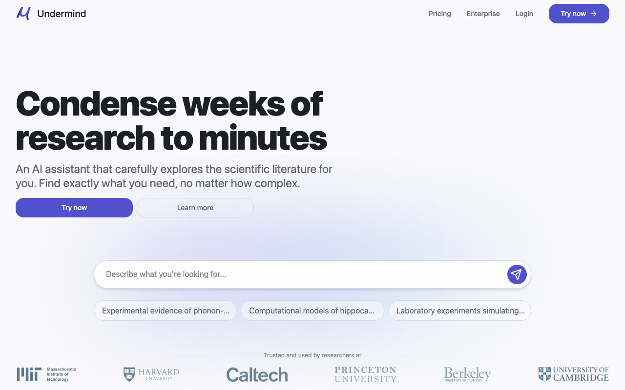 Undermind es un asistente de investigación académica impulsado por IA que explora literatura científica de forma autónoma para responder preguntas complejas con evidencia relevante. En lugar de limitarse a buscar palabras clave, analiza papers, ajusta la estrategia de búsqueda y recorre la red de citas para encontrar información útil.