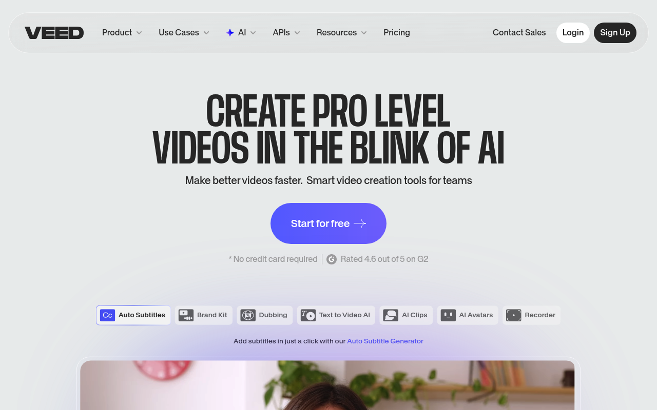 VEED.io es una plataforma de edición de video en línea que utiliza IA para crear videos, subtítulos y traducciones de manera rápida y profesional.