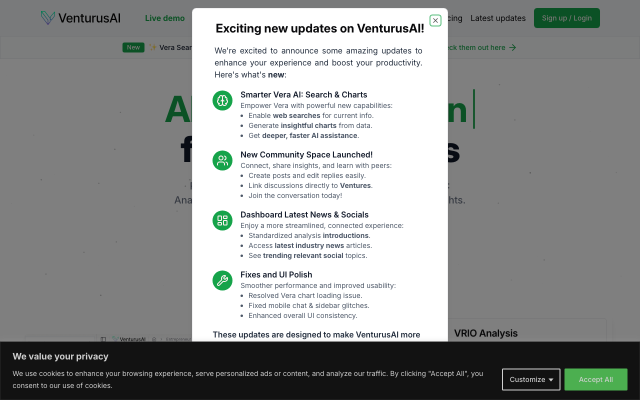 VenturusAI es una herramienta de análisis empresarial impulsada por IA que ayuda a emprendedores y empresas a mejorar sus estrategias con informes detallados y recomendaciones basadas en datos. Equipada con marcos analíticos como SWOT, PESTEL y las Cinco Fuerzas de Porter, VenturusAI proporciona informes completos y personalizables.
