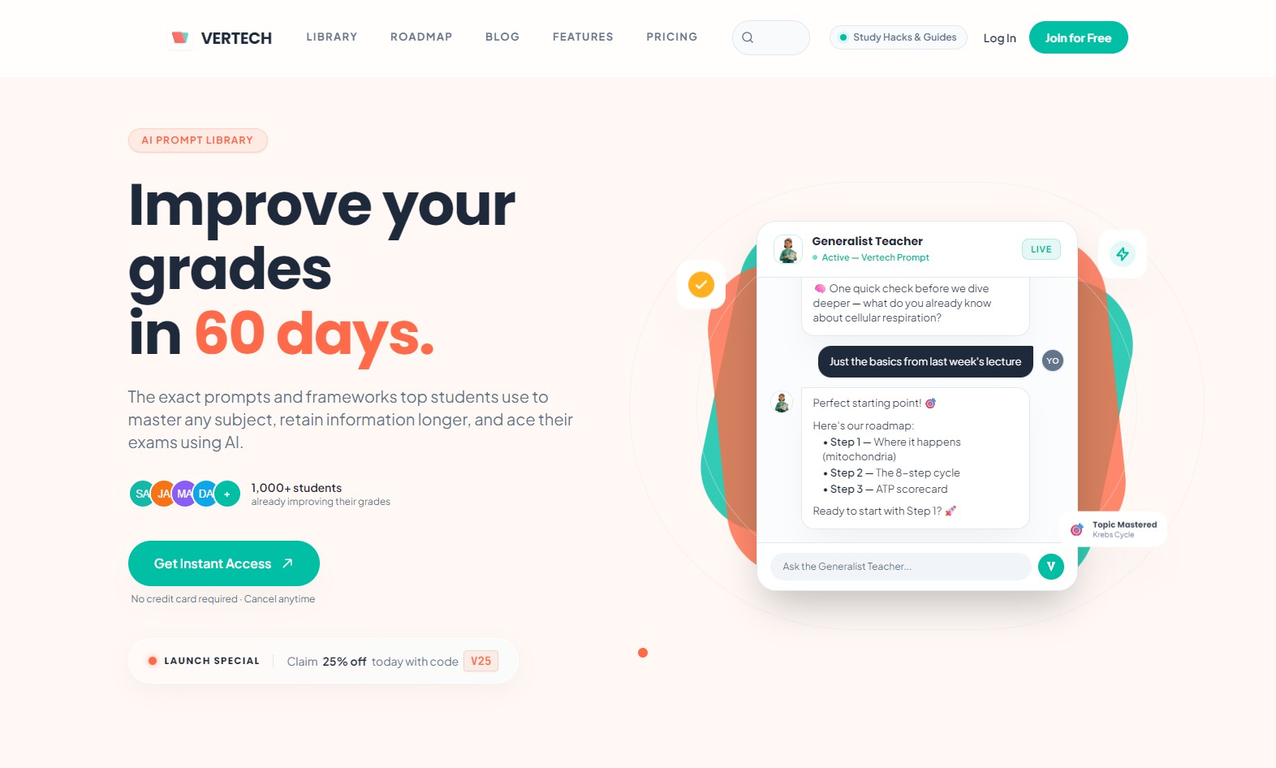 Vertech Academy es una herramienta diseñada para ayudar a los estudiantes a mejorar su rendimiento académico utilizando inteligencia artificial. A través de prompts y marcos específicos, los estudiantes pueden dominar cualquier materia, retener más información y sobresalir en sus exámenes.