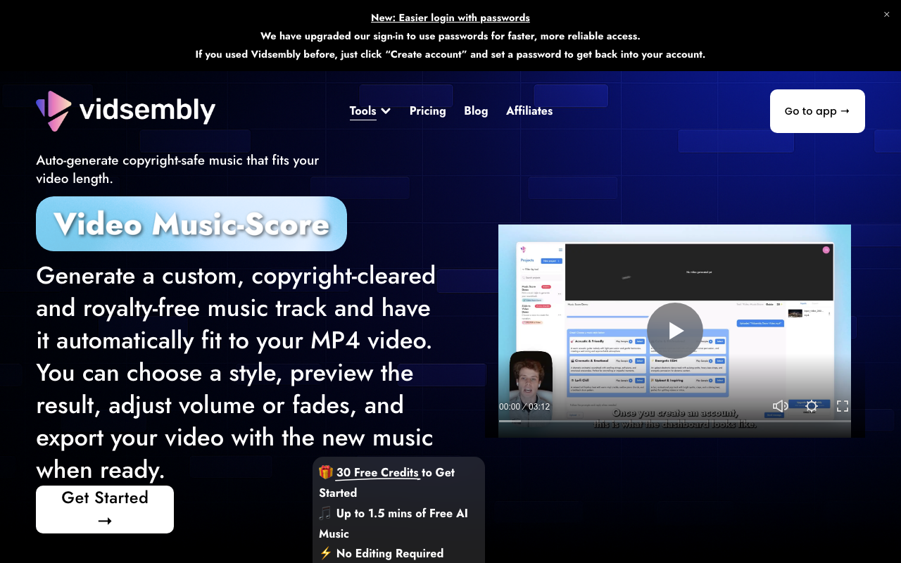 Su propuesta no se limita a generar música: también la ajusta al video, permite previsualizar el resultado, controlar volumen y aplicar fades antes de exportar. Además, funciona con un sistema de créditos compartido dentro de Vidsembly, con opción gratis para empezar sin tarjeta.