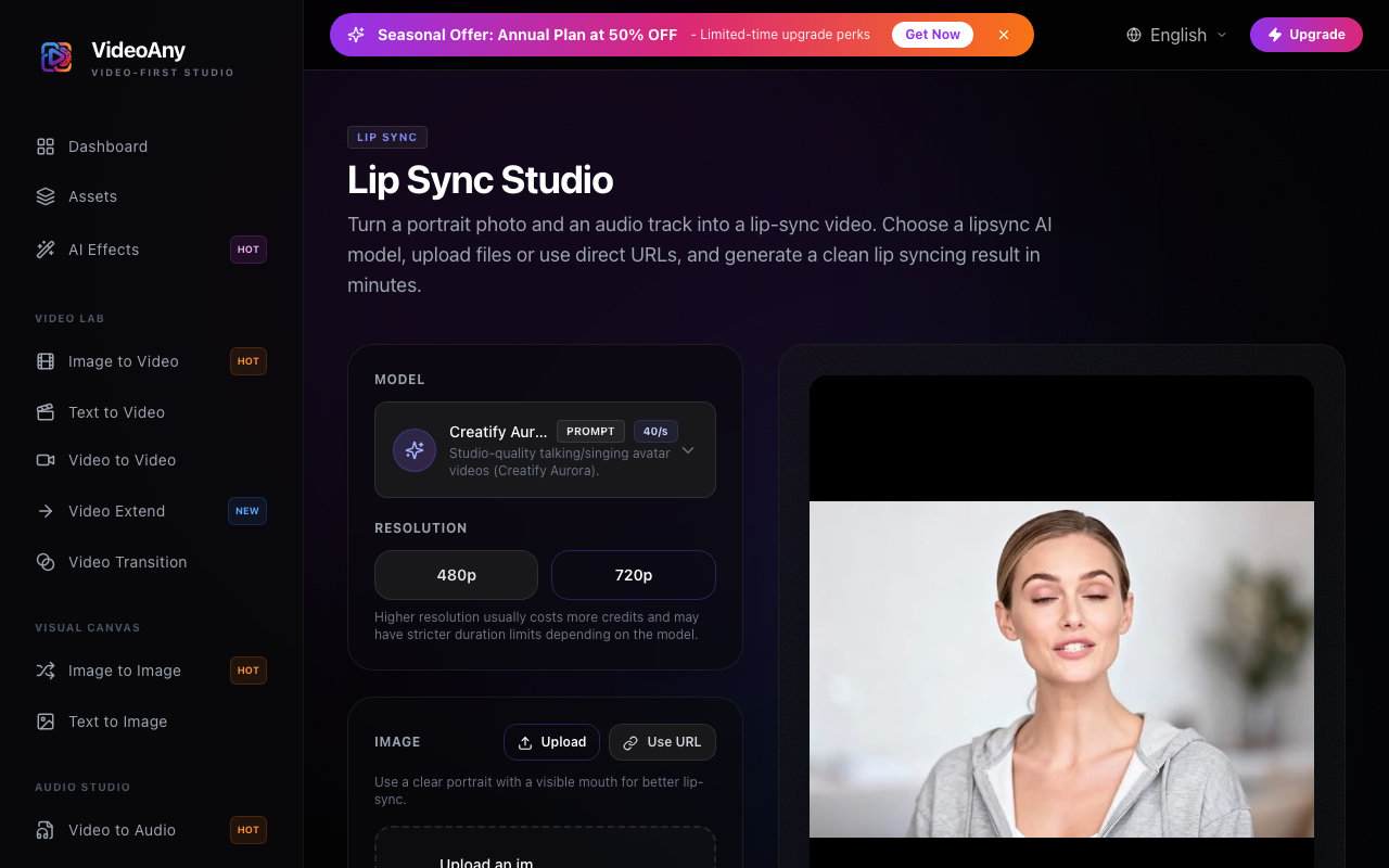 VideoAny Lip Sync AI Online te permite transformar una imagen fija (por ejemplo, un retrato) y una pista de audio en un video con lip sync. El objetivo es que la boca del personaje parezca sincronizada con lo que se escucha, ya sea hablando o cantando.