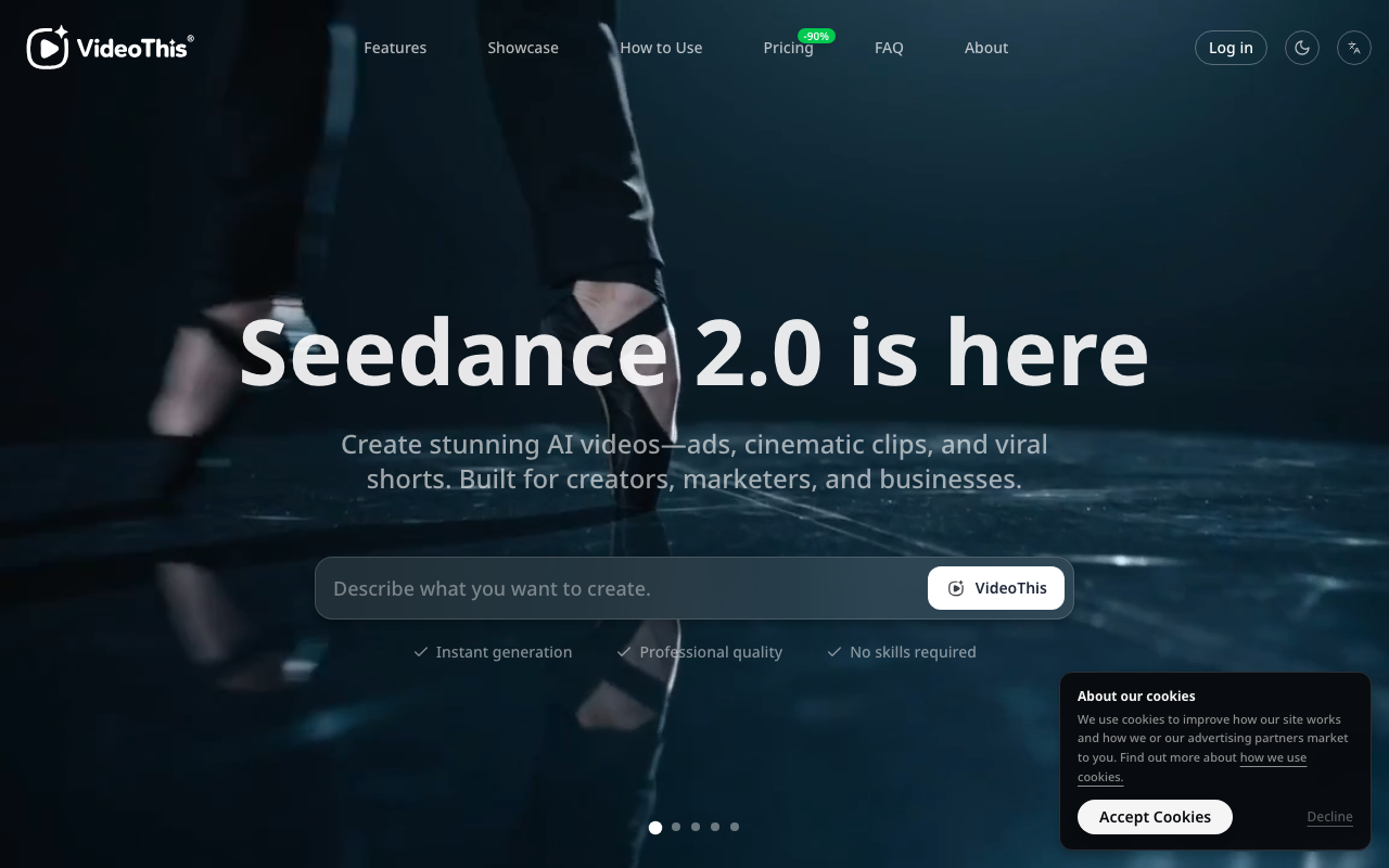 VideoThis es un generador de video con IA pensado para crear contenido profesional sin complicarte con edición ni postproducción. Con su motor Seedance 2.0 y otros modelos, puedes transformar ideas en clips listos para descargar, con estilos variados y resultados pensados para anuncios, escenas cinematográficas y shorts para redes.