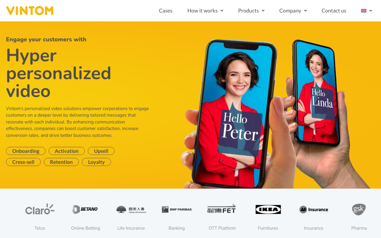 Vintom es una plataforma de tecnología de video personalizado pensada para equipos corporativos que necesitan comunicar a miles o millones de personas con mensajes que se sienten hechos a medida. La idea central es sencilla: convertir el video en algo “programable”, donde el contenido cambia según los datos del destinatario.