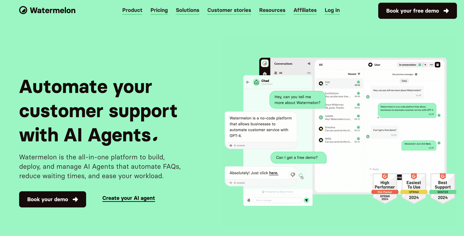 Watermelon es una plataforma de IA conversacional que optimiza el servicio al cliente y automatiza tareas de ventas y soporte.