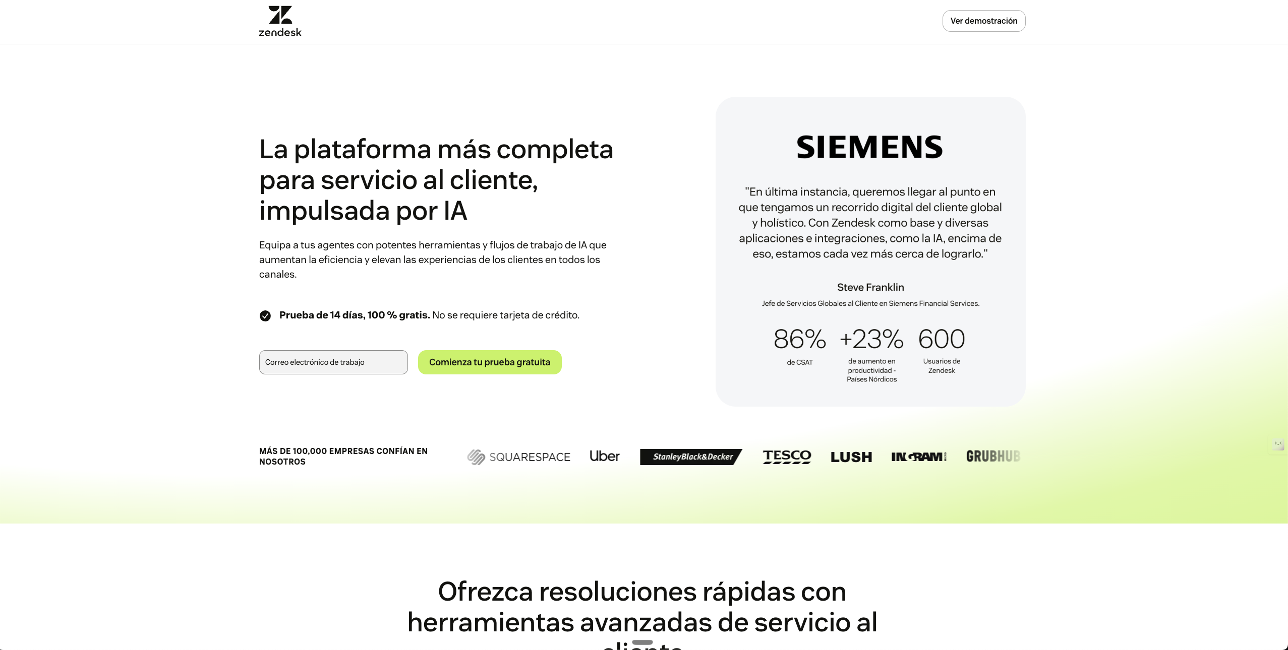 Zendesk es una plataforma de experiencia al cliente impulsada por inteligencia artificial, diseñada para gestionar tickets de soporte, chats en vivo, soporte por voz y portales de autoservicio.